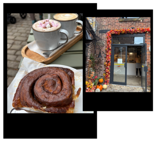 my mom and i went to visit a new cafe/bakery, it was super cozy and decked out for the spooky season / autumn. i order a hot chocolate and a cinnamon swirl bun!